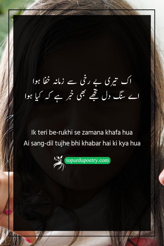 This striking couplet explores the domino effect of a beloved’s indifference on a lover's entire existence. The poet laments that just one instance of be-rukhi (neglect) from the person he loves has caused the whole world to turn against him. It suggests that his social identity and peace were entirely dependent on the beloved's favor; once that link broke, his standing in the world collapsed. In the second line, he addresses the sang-dil (stone-hearted) beloved with a mix of pain and accusation, asking if they even realize the magnitude of the destruction they have triggered. It captures the tragic reality of suffering a public downfall caused by a private rejection.