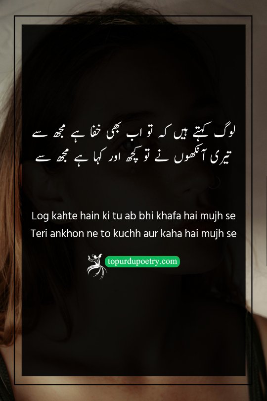 This beautiful couplet explores the silent, non-verbal communication that exists between lovers, even during a conflict. While the 'world' or 'people' may be buzzing with rumors that the beloved is still upset (khafa), the poet remains unconvinced. He trusts a much deeper source of truth: the beloved's eyes. The verse suggests that while outward words or public behavior might show distance, the eyes often betray the heart's true feelings of warmth and longing. It’s a powerful testament to the idea that the soul recognizes the truth even when the ego is putting up a front of anger. It captures that hopeful, intimate moment where a single glance can negate a thousand rumors.