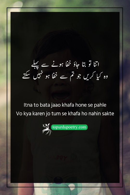 This heart-touching couplet is a classic in the world of naraz-poetry-2-lines, highlighting the absolute helplessness of a true lover. The poet addresses a beloved who is on the verge of becoming 'khafa' (angry). He makes a desperate and vulnerable plea: 'Before you leave in anger, just tell me what should people like me do—those who are so deeply in love that they are incapable of being angry with you in return?' It captures the tragic imbalance of power in a relationship where one person has the freedom to be upset, while the other is so devoted that they cannot even harbor a moment of resentment.