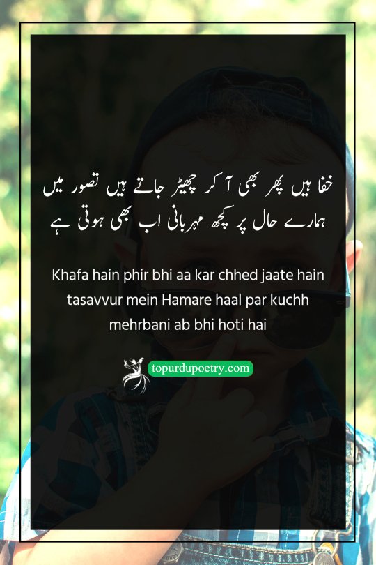 Khafa hain phir bhi aa kar chhed jaate hain tasavvur mein Hamare haal par kuchh mehrbani ab bhi hoti hai