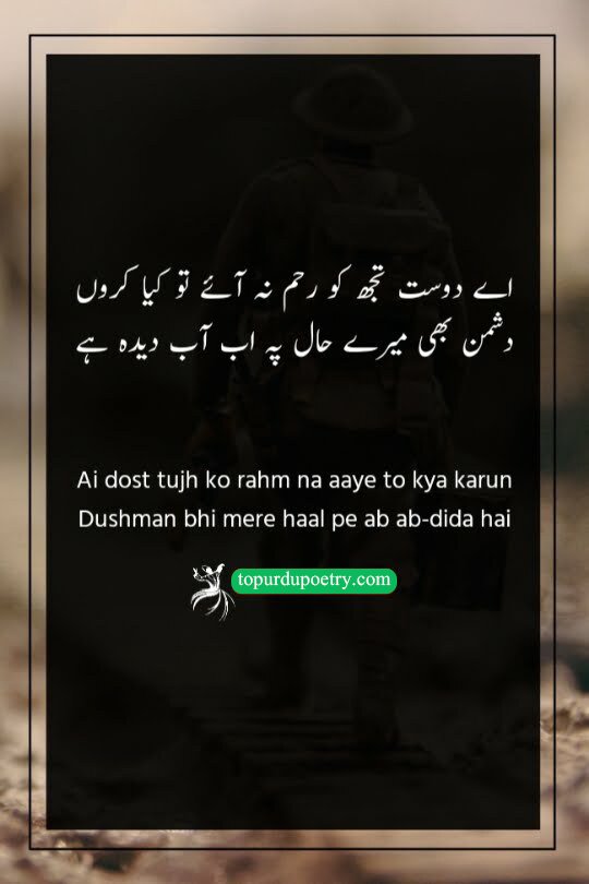 This couplet captures the ultimate irony of a failing friendship. The poet laments that while his friend remains indifferent to his suffering, his condition is so tragic that even his enemies are moved to tears (ab-dida). It highlights a painful role reversal: the friend has become heartless, while the enemy has found compassion. This verse is a powerful choice for 'dost dushman poetry,' perfectly describing the feeling of being completely abandoned by a loved one while even strangers or rivals feel pity for your state.