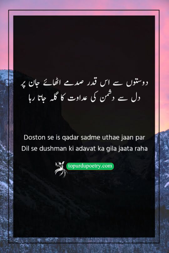 This couplet explores the hierarchy of pain and betrayal. The poet explains that the shocks (sadme) received from friends have been so severe that he has stopped complaining about the enmity (adavat) of his rivals. It highlights a bitter truth: we expect hostility from an enemy, but when a friend causes pain, it is so devastating that it eclipses all other grudges. This verse is a classic choice for dushman-poetry-in-urdu, perfectly capturing the sentiment that a known enemy is often less hurtful than a false friend.