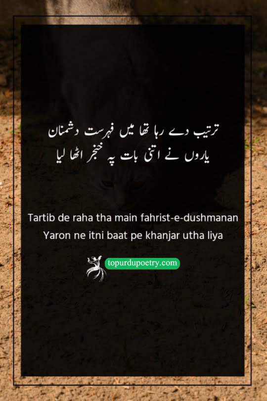 This couplet is a sharp and witty take on the 'hidden enemy' trope. The poet describes a moment of dark realization: while he was simply trying to compile a list (fahrist) of his enemies, his own friends (yaron) instinctively drew their daggers (khanjar). It suggests that the act of looking for an enemy was enough to make the false friends reveal their true nature. It’s a perfect choice for dushman-poetry-in-urdu, highlighting that the most dangerous rivals are often those who sit right beside us, waiting for the right moment to strike.
