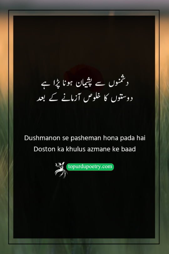 This couplet captures the bitter irony of misplaced trust. The poet explains that after testing the 'Khulus' (sincerity) of his friends, he was left so disappointed that he felt 'Pasheman' (embarrassed) in front of his enemies. It suggests that while we often defend our friends against our rivals, a friend’s betrayal can make us look foolish or regretful for ever doubting the enemy's honesty. This verse is a powerful choice for poetry-for-dushman, reflecting the sentiment that an honest foe is far more respectable than a friend who fails the test of loyalty.