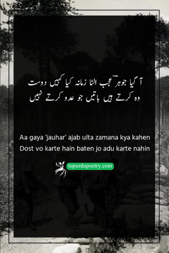 This couplet is a stinging critique of the modern era, where social norms and loyalties have been flipped upside down. The poet, using his pen name 'Jauhar,' expresses shock that friends (dost) are now behaving in ways that even a sworn enemy (adu) would avoid. It highlights the ultimate betrayal: when those close to you cross lines of decency that even a rival would respect. This verse is ideal for 'dushman-poetry' collections as it highlights the irony that sometimes, a friend can be more hurtful than a foe.